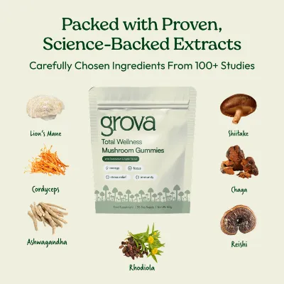 The health benefits are magical but these are not magic mushrooms! Grova's Total Wellness Gummies are made with 100% natural, functional mushrooms like Lion’s Mane, Reishi, Chaga, and Cordyceps, which are known for their wellness benefits. They do not cause psychoactive effects.