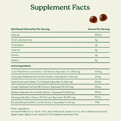 Five powerful functional mushrooms, packed into a delicious gummy — for energy, focus, and stress relief that lasts.